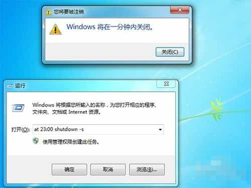 假设设置系统在晚上11点关闭,按下“Windows徽标键+R”,在弹出的“运行”窗口中输入“at 23:00 shutdown -s”,按下回车键即可。在系统关闭前一分钟,会弹出提醒窗口。注意:上述命令包含3个空格,不含引号。在命令符窗口输入命令也会达到相同效果。使用此命令时,计划服务必须在运行中。