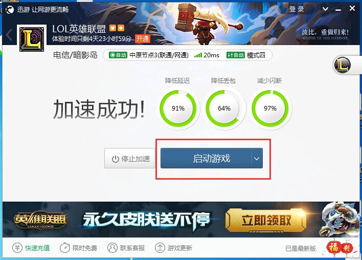 5、点击启动游戏后,迅游网游加速器会自动启动该软件的客户端,用户在游戏客户端登陆完成以后就可以享受到迅游加速的极速体验服务,该软件可免费试用几天,试用期过后想用就得付钱了,所有有需要的朋友可以好好考虑。