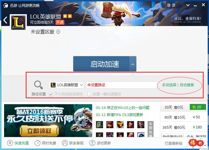 点击需要添加的游戏,如LOL,可以看到“未设置区服”,点击进行手动选择,选择完成后点击“启动加速”胖的三角按钮,设置好游戏安装目录