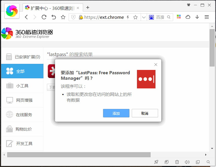 lastpass是一款浏览器插件,几乎所有的浏览器都有其插件,这里小编以我谷歌内核浏览来做演示,以360为例。