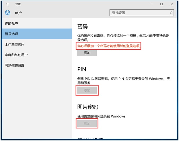 2、在“帐户设置”页面选择“登录选项”,在右边栏中找到“图片密码”点击“添加”