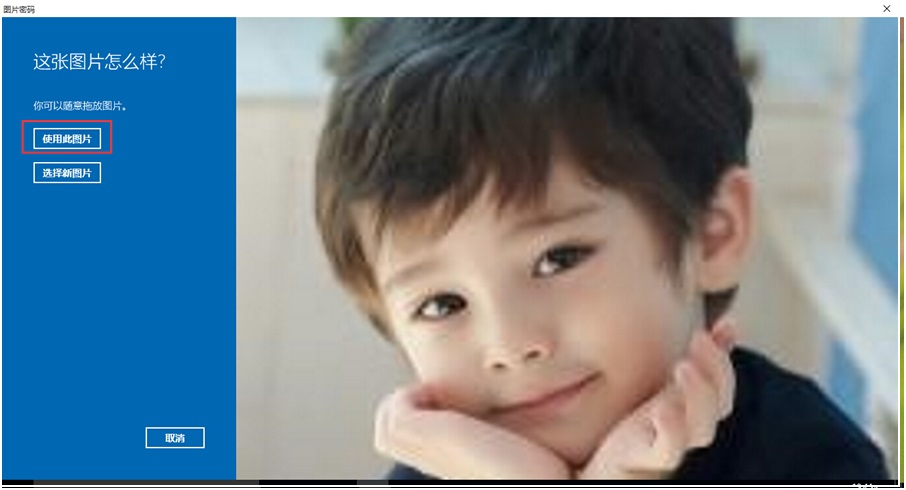5、当在电脑中选择好图片之后,出现确认界面,也可以说是预览界面吧,在这界面可以拖放图片,点击“使用此图片”确认使用该图片为密码图片,点击“选择新图片”重新选择图片