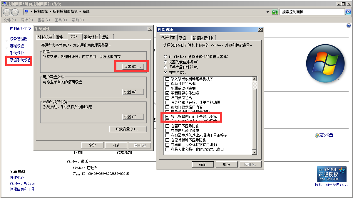2.开启电脑高级设置,调整性能选项卡中的视觉效果,勾选显示略缩图: