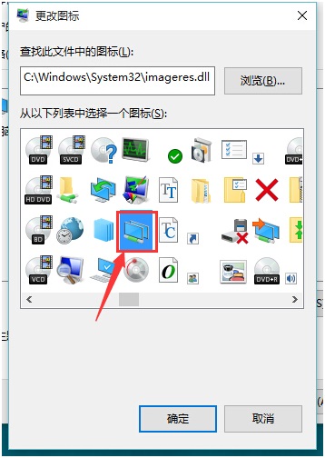 4、在图标选择栏中选中自己喜欢的图标,点击“确定”按钮。(如果图标栏中没有自己喜欢的图标,也可以自己制作图标,图标制作好之后放到C盘。制作图标需要特地的格式*.dll文件)