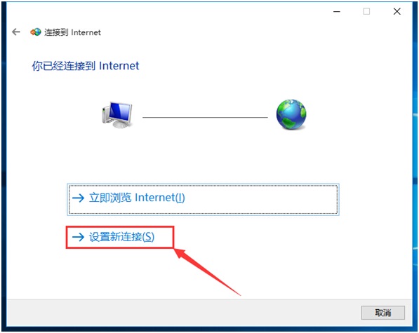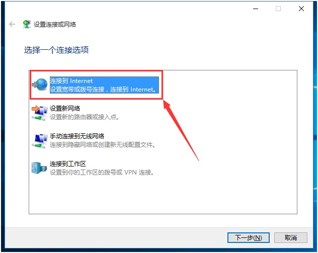 4、在“设置连接或网络”窗口中选择“连接到Internet”,点击“下一步”: