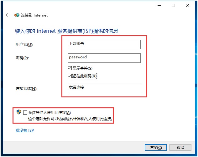7、输入上网帐号和密码,勾选“记住此密码”。如果电脑有多个用户使用,其它用户也要使用此连接上网的话,勾选“允许其他人使用此连接”,如果不让其它用户使用就不要勾选。
