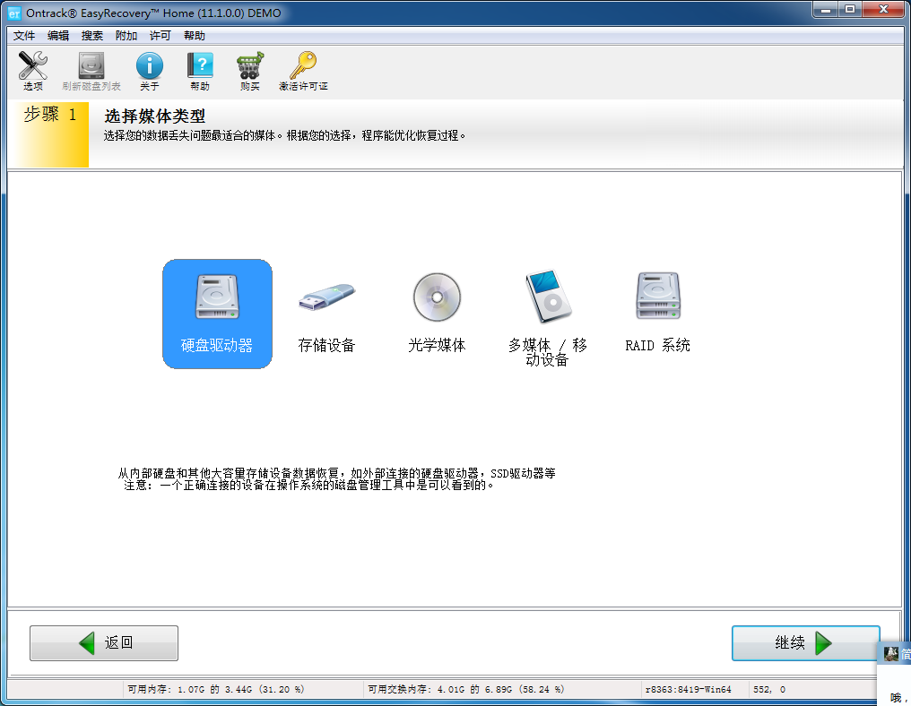 2、选择存储器类型;台式电脑、笔记本选择“硬盘驱动器”,U盘和SD卡选择”存储设备”,手机/平板/MP4等移动设备选择”多媒体/移动设备”,双硬盘的磁盘阵列选择”RAID系统”。本文以“硬盘驱动器”为例做恢复。