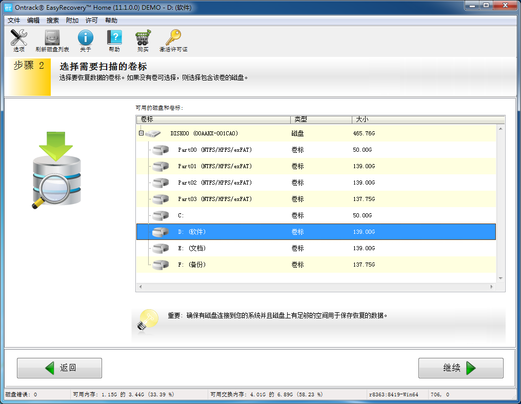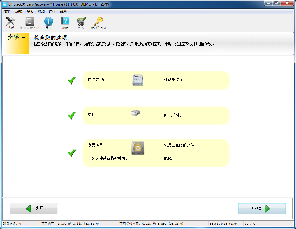 5、点击“继续”按钮开始扫描,寻找丢失的文件。