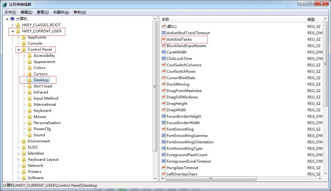 2、在弹出的注册表编辑器窗口里依次展开“HKEY_CURRENT_USER/Control panel/Desktop”,在右侧窗口找到“AutoEndTasks”并双击,如下图所示: