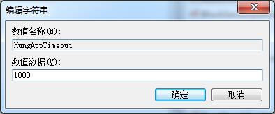 4、在右侧窗口拉动滚动条找到“HungAppTimeout”并双击,在弹出的编辑字符串对话框中把数值数据的数值改为“1000”,点击“确定'按钮,如下图所示: