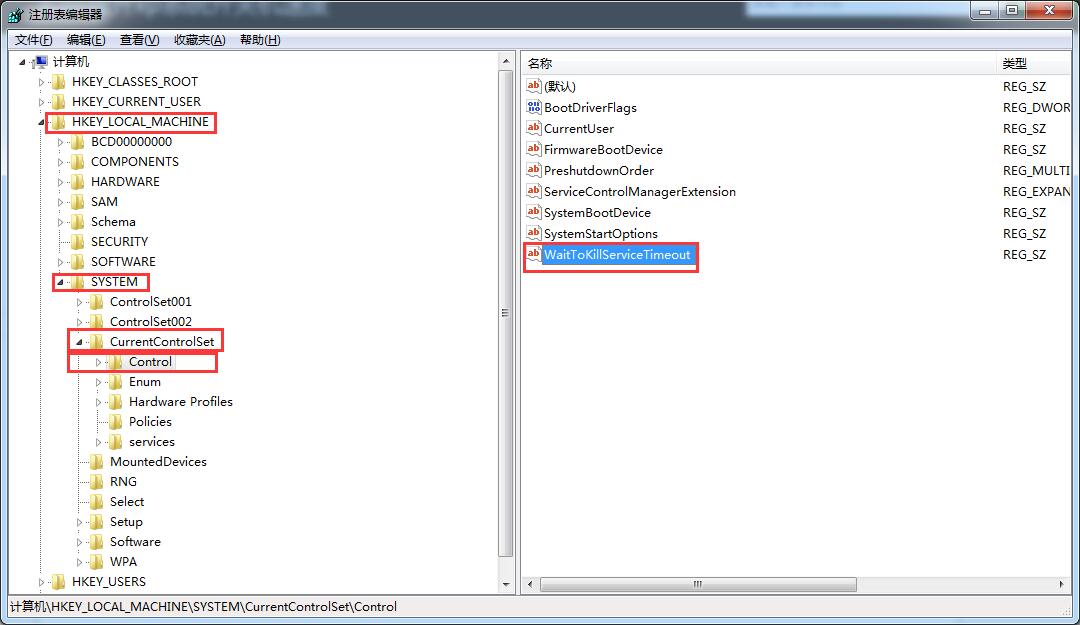5、接着在注册表编辑器里依次展开“HKEY_LOCAL_MACHINE/System/CurrentControlSet/Control”在右侧窗口找到“WaitToKillServiceTimeout”并双击,如下图所示: