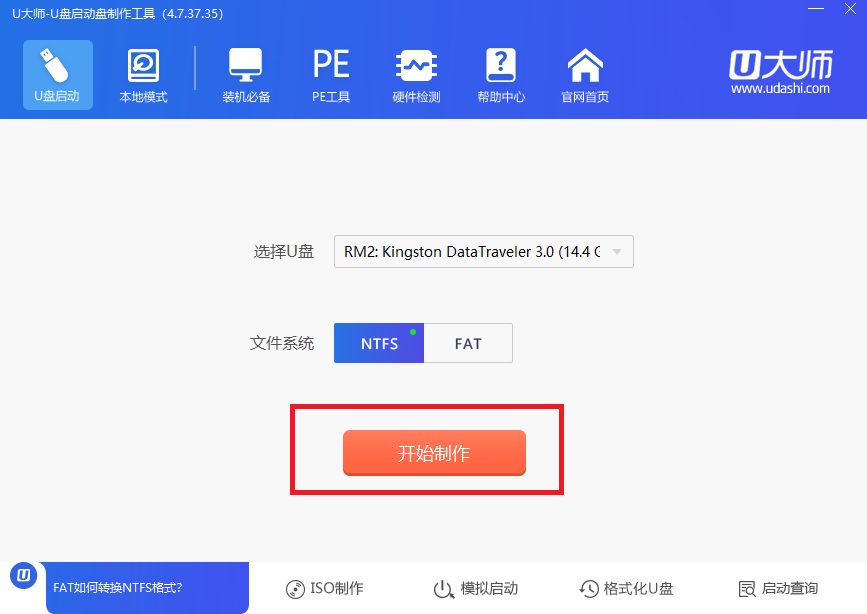 2、 下载完开始安装U大师,然后插入U盘点击开始制作(制作时会将U盘格式化,请先备份资料)。