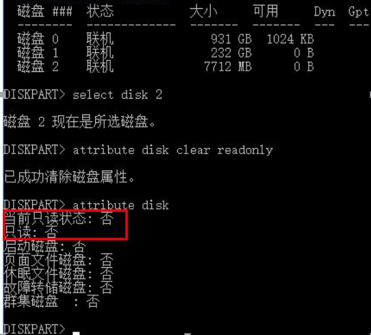 我们可以继续运行 attributes disk 命令查看一下磁盘属性看“写保护(只读属性)”是否已经被清除。如上图中“只读状态”显示为“否”即说明“写保护”已被成功去除。