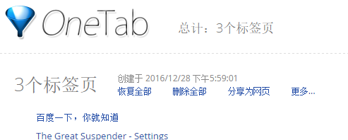 onetab和The Great Suspender都是其中非常出名的一种,原理都是将我们不常用的网页一次快速回收,避免资源占用,在我们需要时候的时候,随意一点就可以快速的恢复