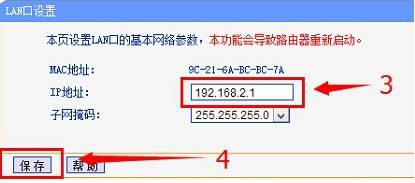 3、在“IP地址”后面填写:192.168.X.1(X可以是2-255间的任意数字),设置之后要记住该IP地址,因为后期如果要设置路由器的话就需要使用我们刚设置的这个ip地址才可以进入(后期忘记ip地址只能通过重置路由器来解决)点击“保存”;