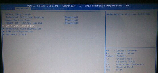 步骤1:重启电脑,在出现电脑画面时按下对应快捷键进入bios,通常进入bios的快捷键有del、f2与f1三个,在用户不知如何进入bios时可使用这些按键尝试进入。在进入bios界面中,使用键盘上的左右键方向键选择Advanced,接着选择SATA Configuration,如下图所示:
