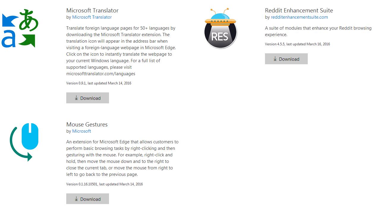 目前提供了三个示例扩展,分别为微软翻译,鼠标手势以及reddit扩展。这三个扩展都可以下载,下载后运行会打开文本文档,提示你具体的安装过程。当然,这只是预览阶段的安装方法,在未来Edge浏览器扩展将会在应用商店提供下载。