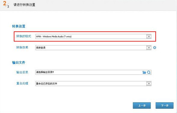 5、点击下一步,进入到输出设置页面。选择输出格式为WMA,完成之后,点击下一步开始提取