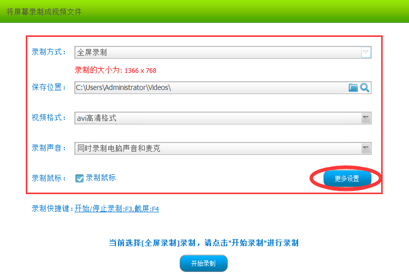 2、点击“屏幕录制”,进入屏幕录制设置界面,在界面中设置各种需要,更多设置中包含摄像头等设置,可根据录制需要进行特殊设置。