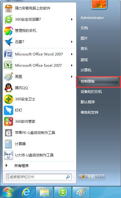 1、点击屏幕左下角的“开始”,在弹出的开始菜单中找到并点击“控制面板”进入: