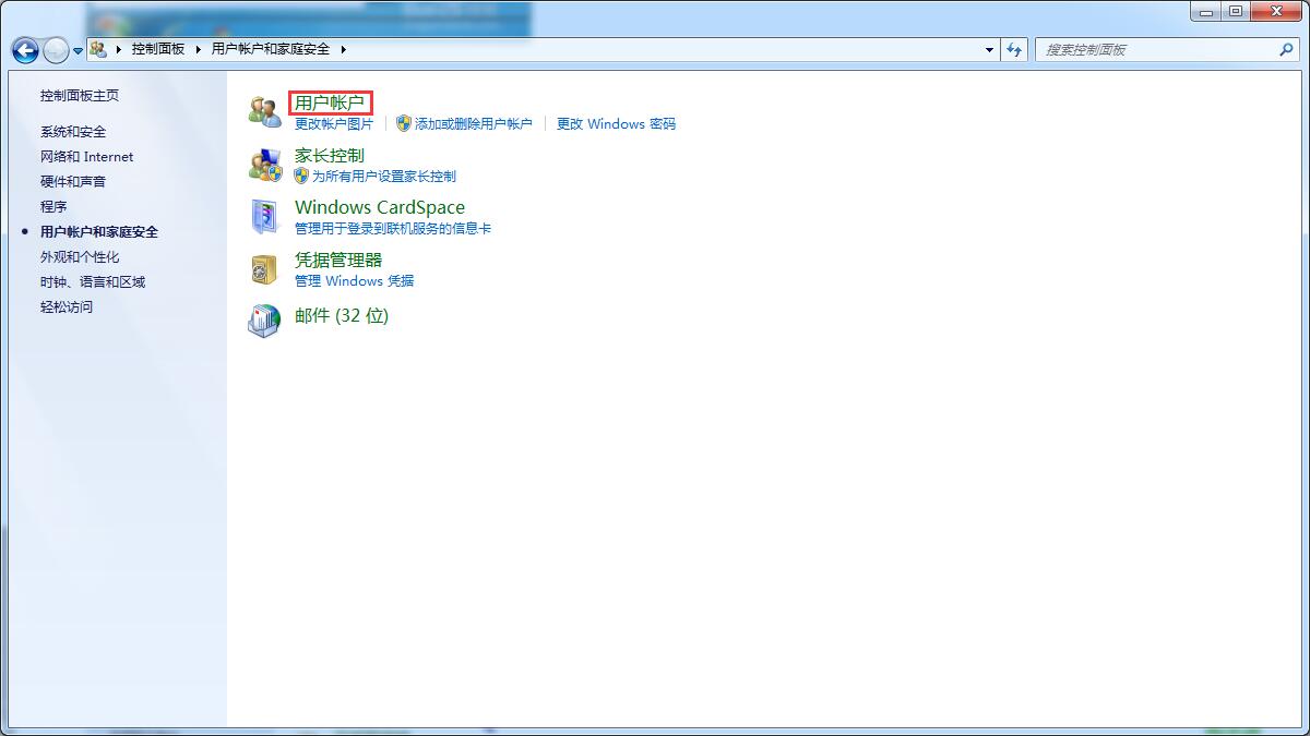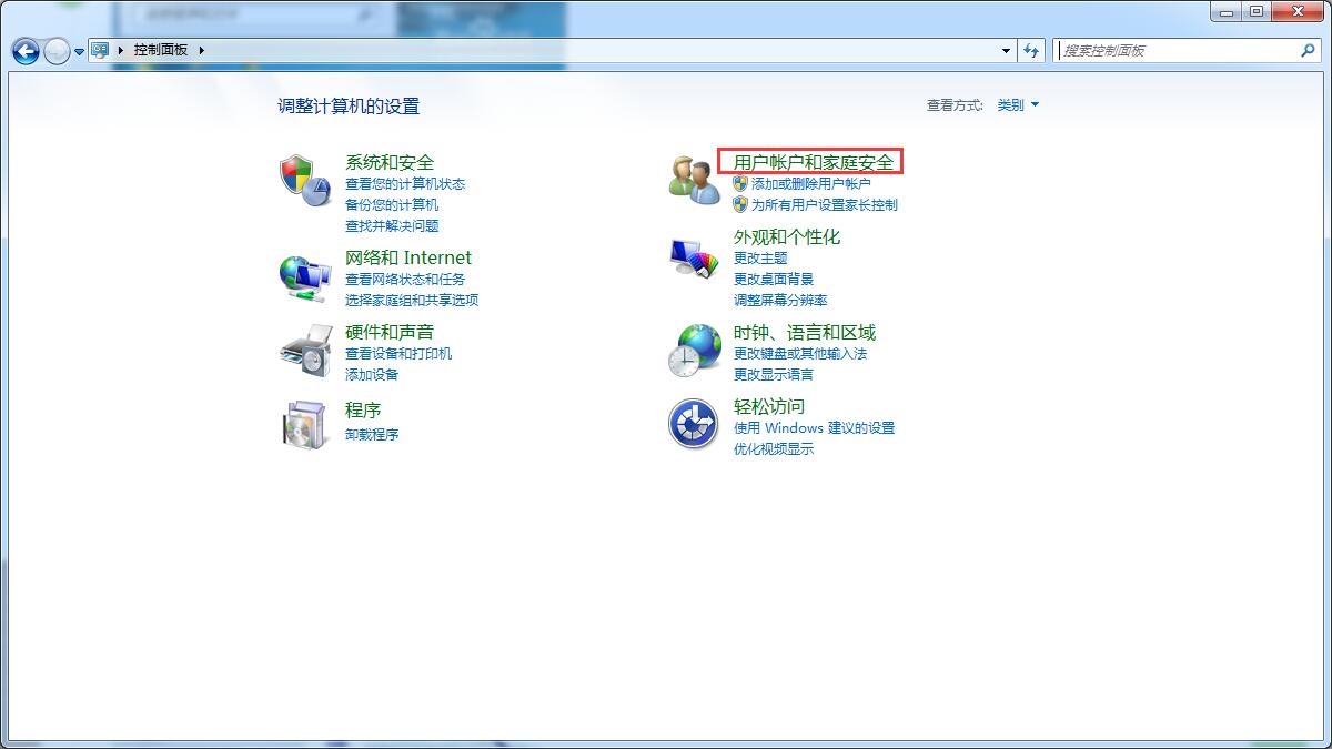 2、在"控制面板"窗口,找到"用户账户和家庭安全“进入;