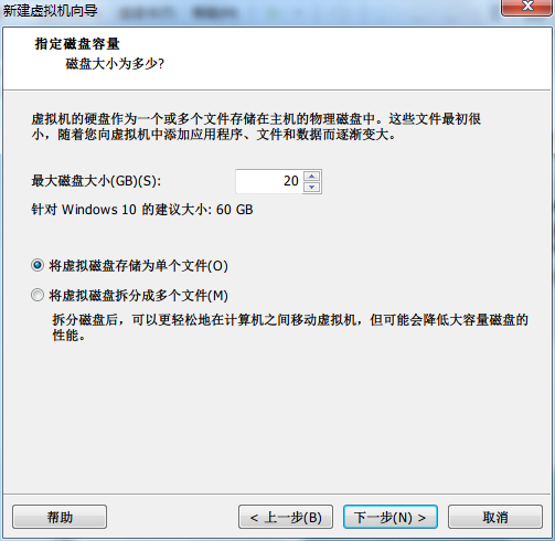 完成之后下一步分配硬盘空间,选择合适的空间,win10安装需要10G以上,这里小编给20G足够了: