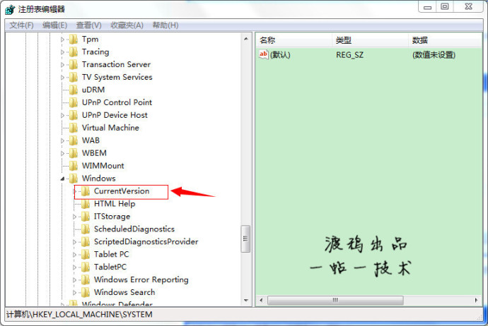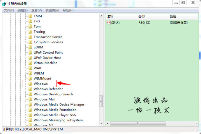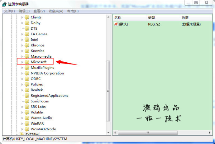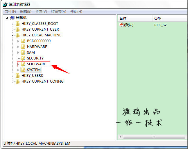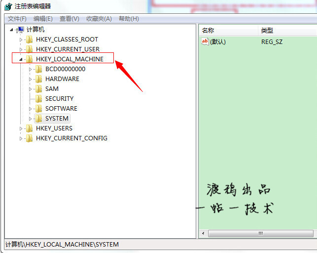 进入注册表,找到“HKEY_LOCAL_MACHINE”,请根据下图指示,点红色框内箭头所示的文件夹前的+按扭
