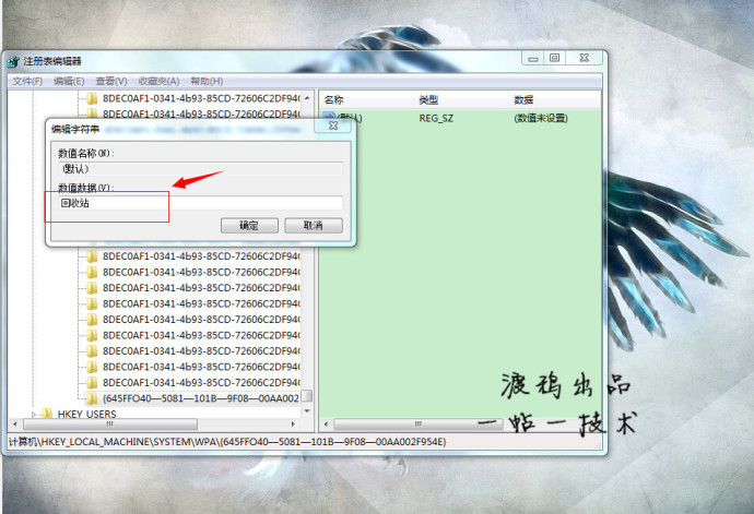 点击修改后,出现如下界面,请在数值名称一项中,将“{默认 }”修改为“{回收站}”点击确定