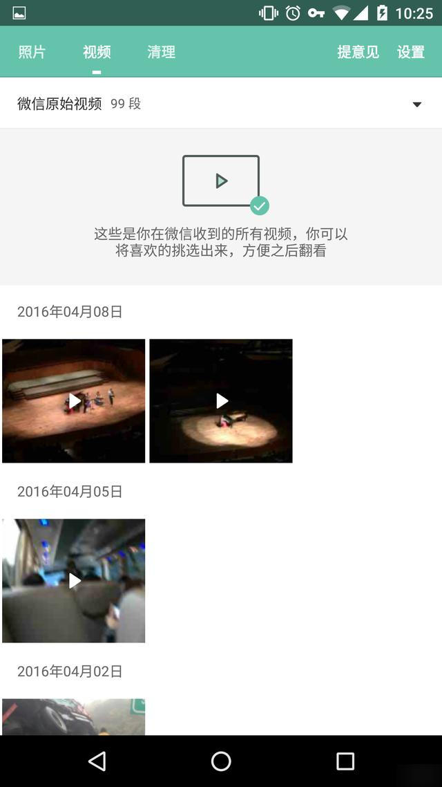 微信助手App可以把微信的图片和视频整理好,也可以直接查看视频和图片。开启图片视频后,还能够直接分享给微信好友和朋友圈。此外,微信助手App还有清理功能,如果觉得微信的缓存占据了太多空间,可以用这App清理一下。