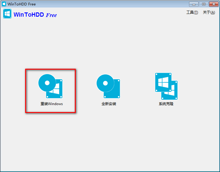 2.安装完成,选择“以管理员身份运行” WinToHDD,软件为中文界面,我们直接选择重装系统。