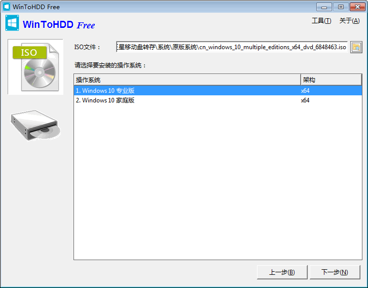 这里小编以win10为例,WinToHDD 会识别出 ISO 镜像文件中的操作系统版本,譬如图中包含了 Win10 64位家庭版或者专业版。