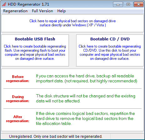 HDD Regenerator(硬盘坏道检测)是一款功能实用的硬盘检测和修复工具,能够全面扫描并检测硬盘存在的各类问题,并且还支持硬盘表面的物理坏道修复功能,使得硬盘坏道再生,修复不可读取的受损信息。
