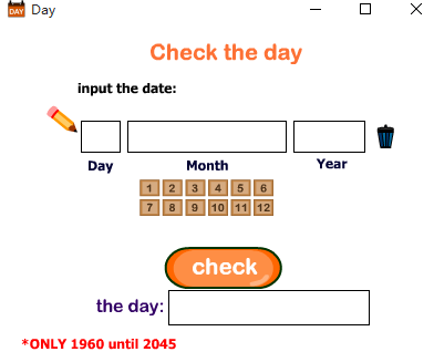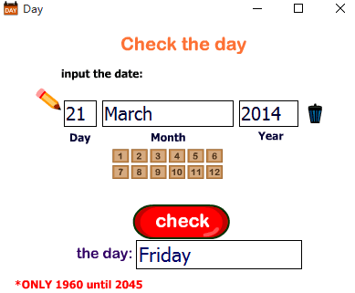 Ezi Day是一款简单易用的桌面日期查询工具,软件界面非常的简洁,操作方便。只需要输入年月日,然后点击check按钮,软件就可以帮你快速查出那一天是星期几,使用非常简单。软件界面非常的友好,相信你会有一个不错的使用体验。