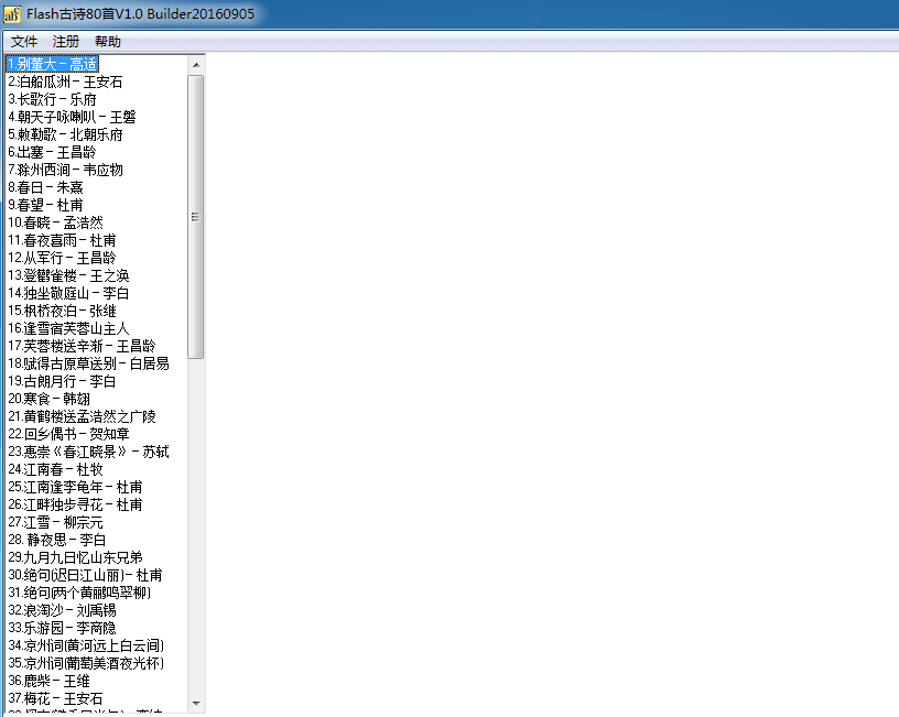 Flash古诗80首是一款十分好用的古诗词学习软件,共有80多首经典必备古诗,包含古诗背景、故事讲解、问题思考等多个版块,可以让孩子轻松掌握古诗中各方面内容。软件界面十分简洁,点击需要学习的诗词即可播放。