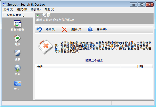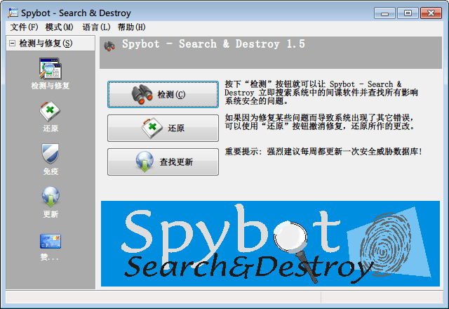 SpyBot-Search & Destroy 是专门用来清理间谍程序的工具。软件主要功能是对电脑进行扫描,找出电脑中隐藏的间谍软件,并将其清理出电脑。软件能识别一万多种间谍软件,扫描查杀能力强悍,支持简体中文,一键式操作,简单方便!