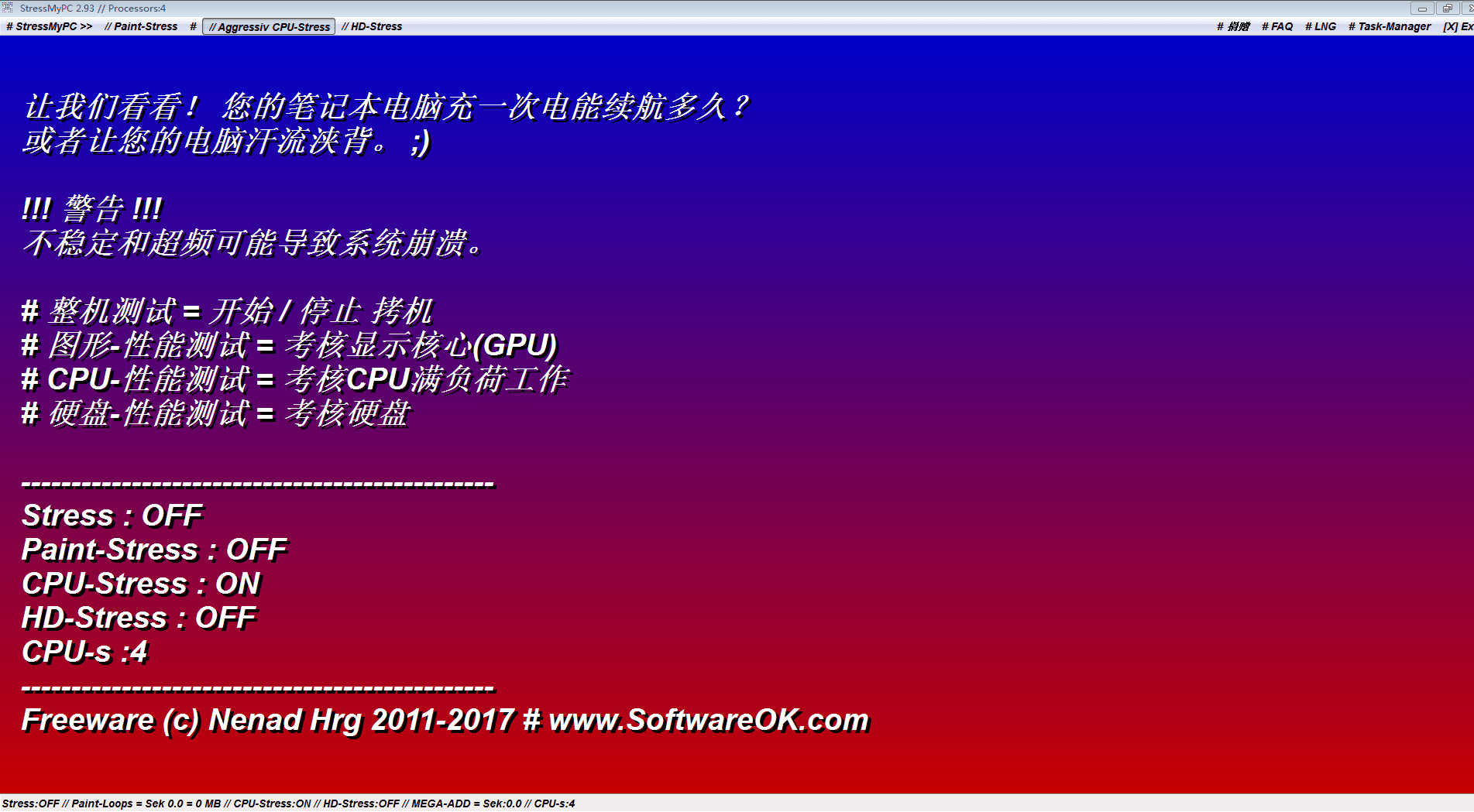 Stress My PC v2.71中文绿色版,是一款硬件稳定性压力测试工具,主要用来对显示器进行测试,能够测试出显示是否含有坏点了,是我们常用的显示好坏甄别软件之一。