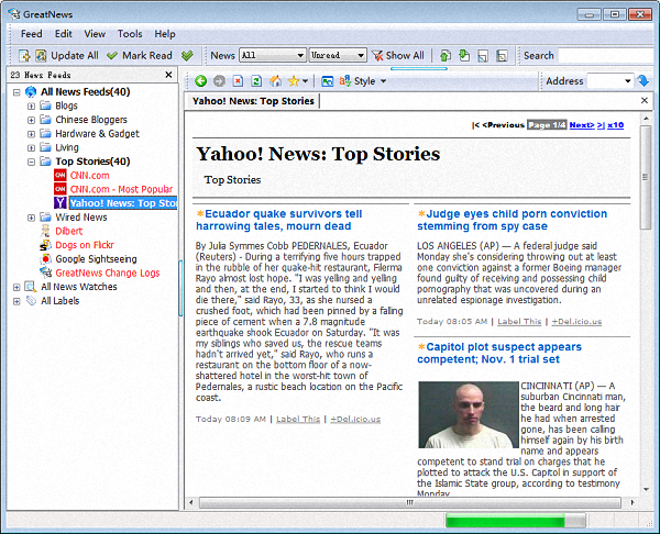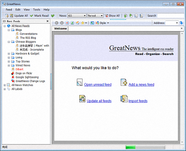 GreatNews是一款功能强大的RSS阅读工具,具备速度快、兼容性强、绿色安全等特点,它能够同步更新新的新闻消息,同时还可以定时清理失去时效性的新闻,或者帮助您将有用的新闻消息下载并保存到本地,方便阅读。操作简单,欢迎下载使用!